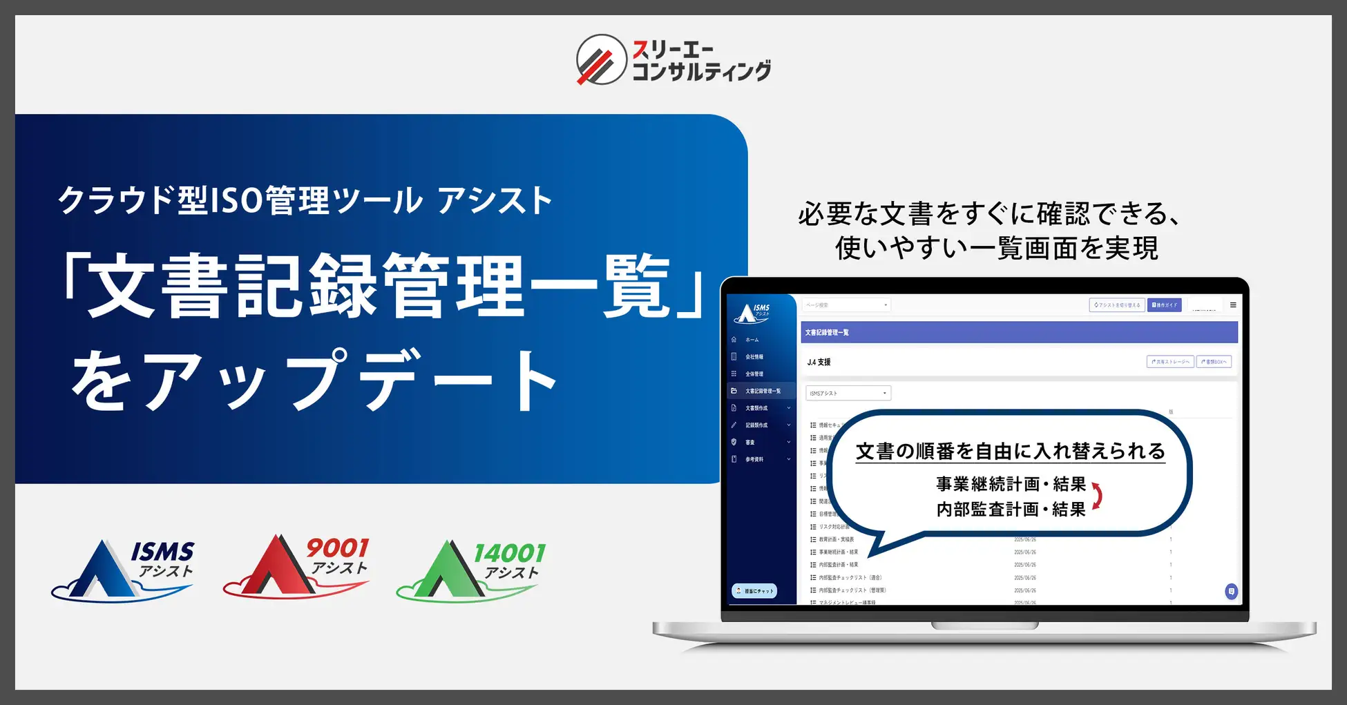 当社が提供するクラウド型ISO管理ツール『ISMSアシスト』『9001アシスト』『14001アシスト』において、文書管理機能の利便性向上を目的とした画面表示のアップデートを実施し